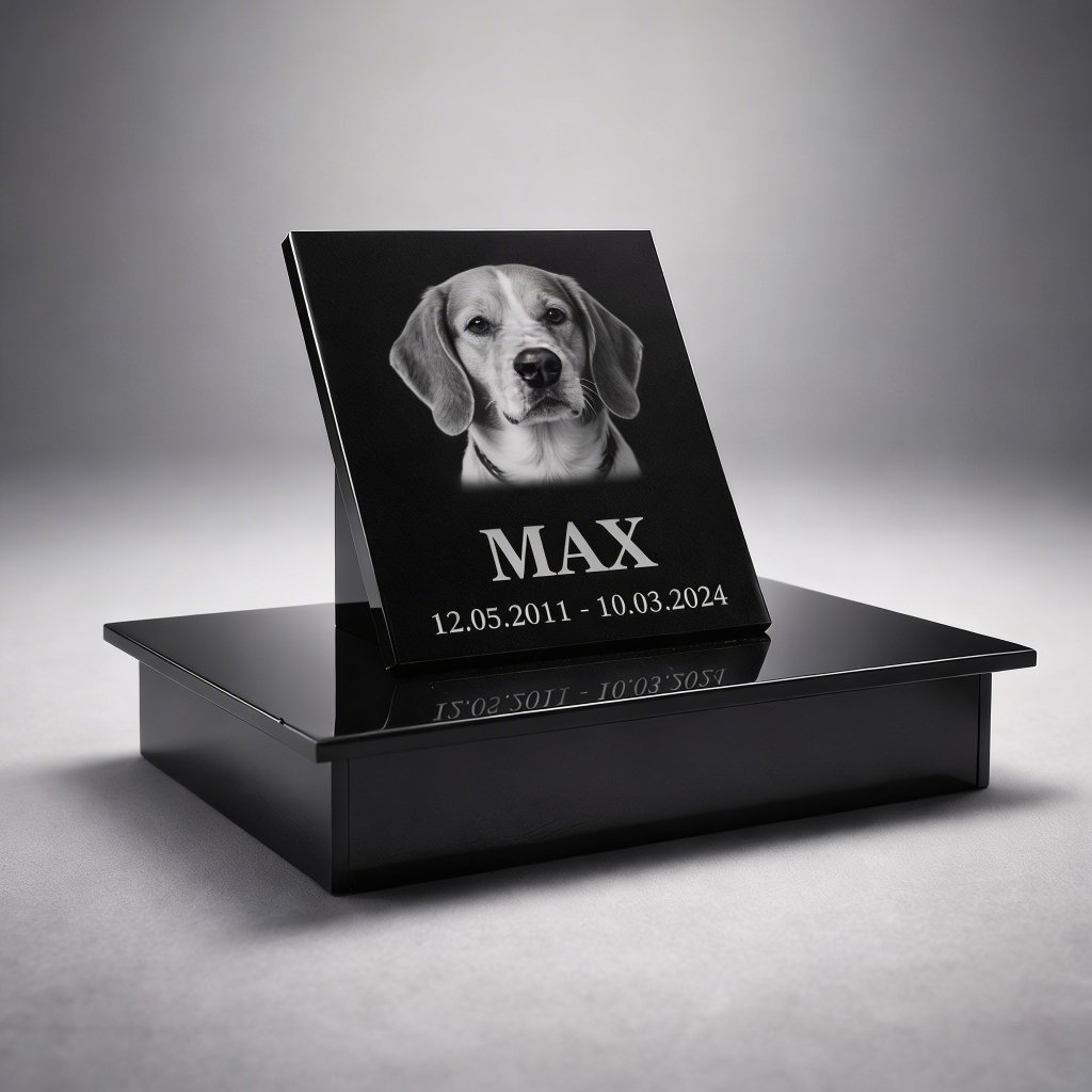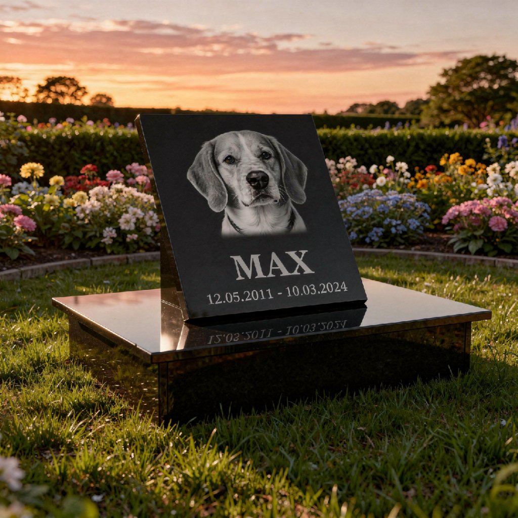 Stojaca pamätná doska s gravírovanou fotografiou a menom zvieratka vytvára osobné miesto spomienky, ktoré bude trvalou pamiatkou na vášho štvornohého priateľa.