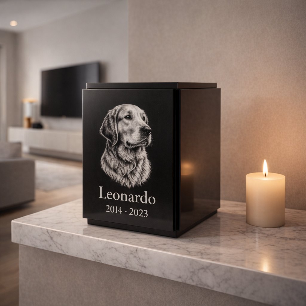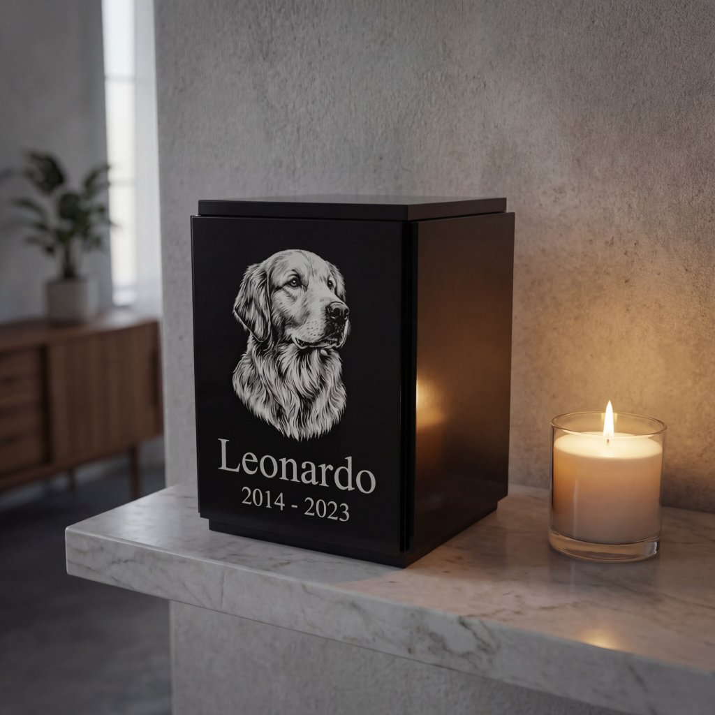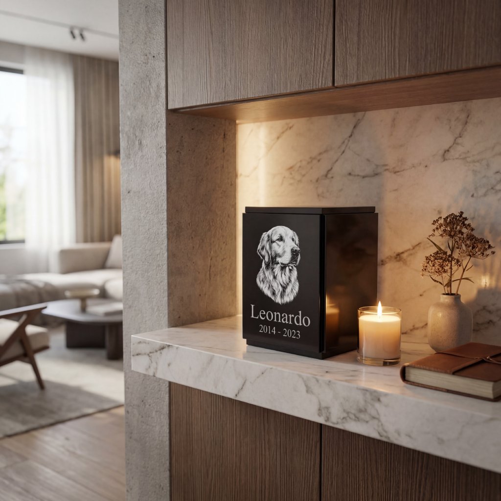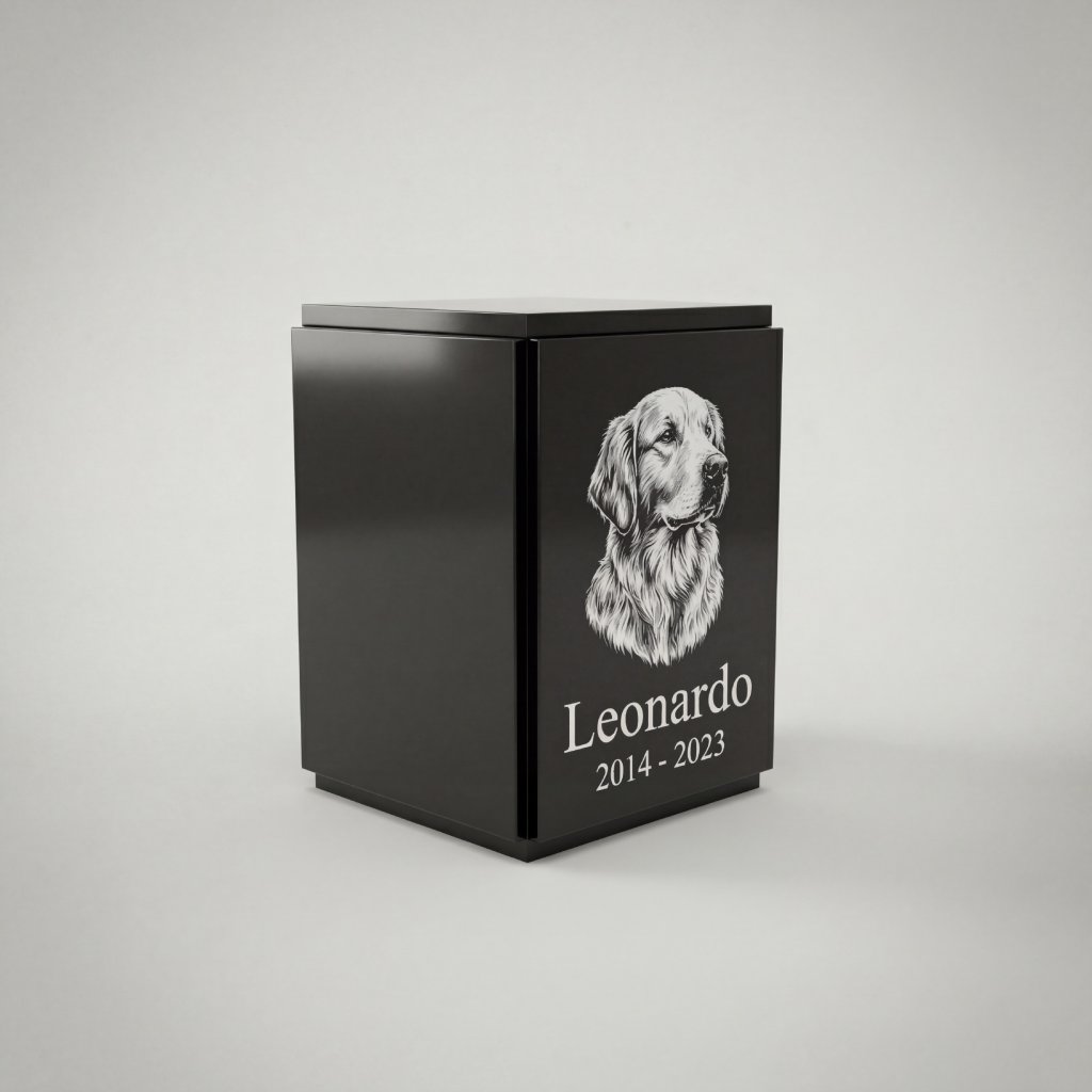 Uctite si pamiatku svojho verného priateľa dôstojným a elegantným spôsobom priamo v pohodlí vášho domova. Táto luxusná interiérová urna zo žuly Absolute Black je navrhnutá ako jemný, no výrazný doplnok do bytu – vhodná na poličku, komodu, vitrínu alebo tiché spomienkové miesto. Nadčasový dizajn zaisťuje, že spomienka zostáva blízko každý deň, a zároveň sa prirodzene hodí do moderného interiéru.