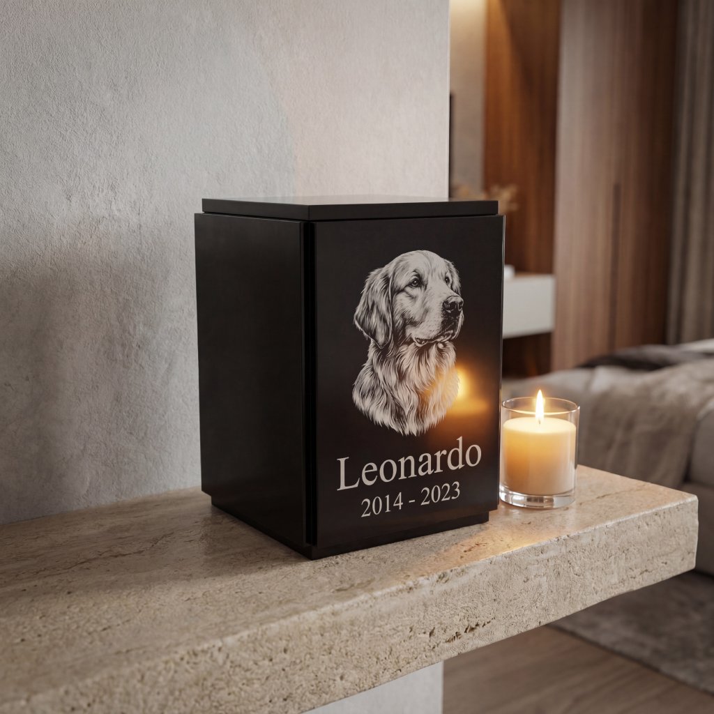 Luxusná interiérová urna pre psíka – Absolute Black s fotkou Elegatná urna do bytu pre psíka a mačku