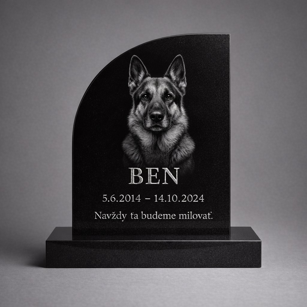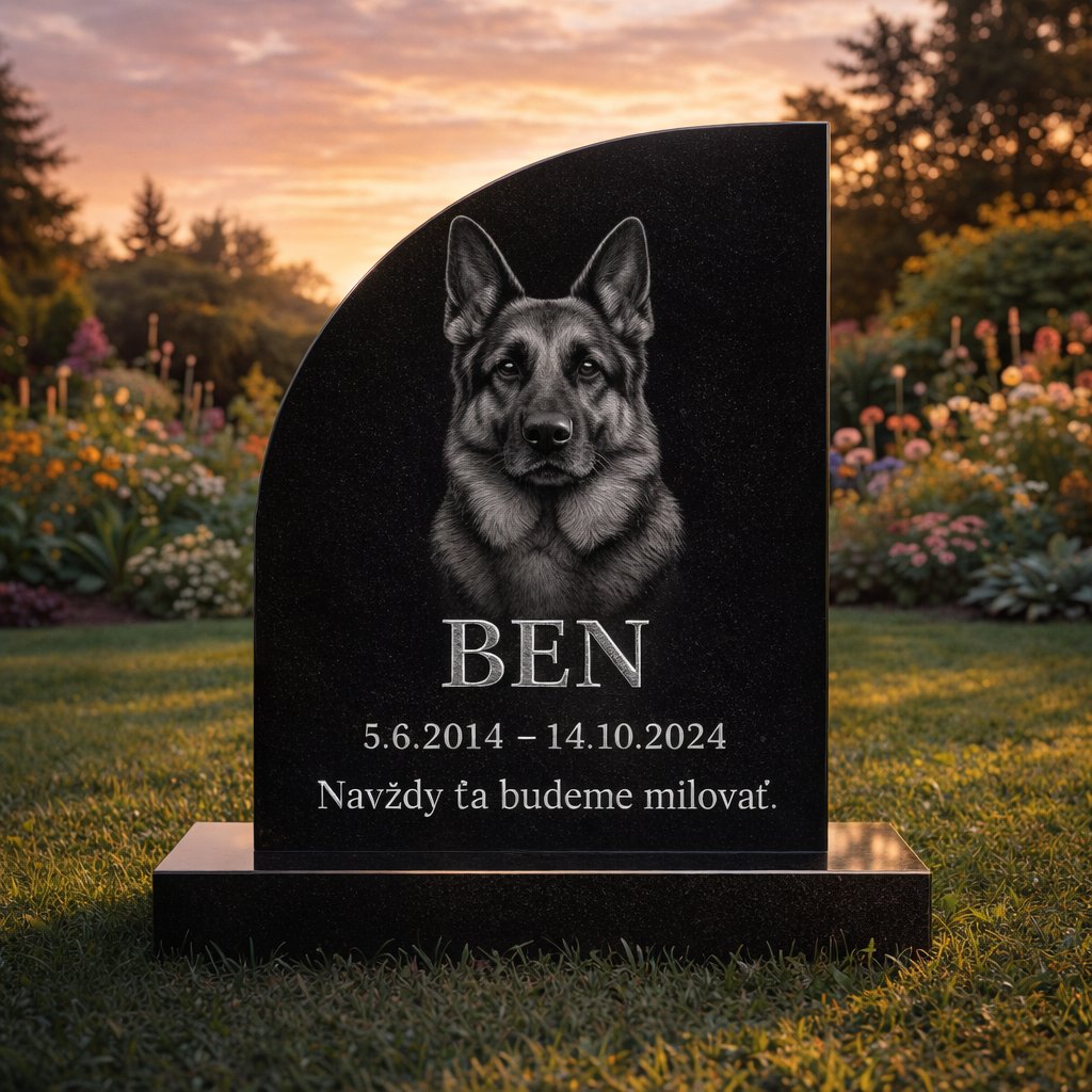 Dôstojná a nadčasová spomienka na verného priateľa. Tento moderný oblúkový pomník s podstavcom z prémiovej žuly Absolute Black vyniká čistými líniami, elegantným spracovaním a vysokou odolnosťou do exteriéru. Hlboká čierna farba s jemným leskom pôsobí pokojne a výnimočne, bez zbytočnej okázalosti.
